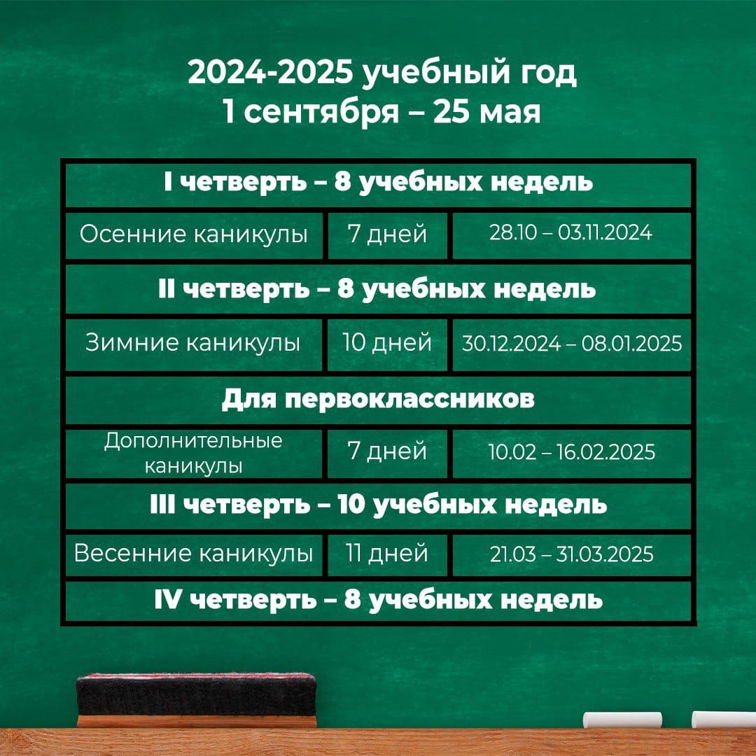 🔔В организациях среднего образования 2024 – 2025 учебный год начнется 1 сентября и завершится 25 мая.